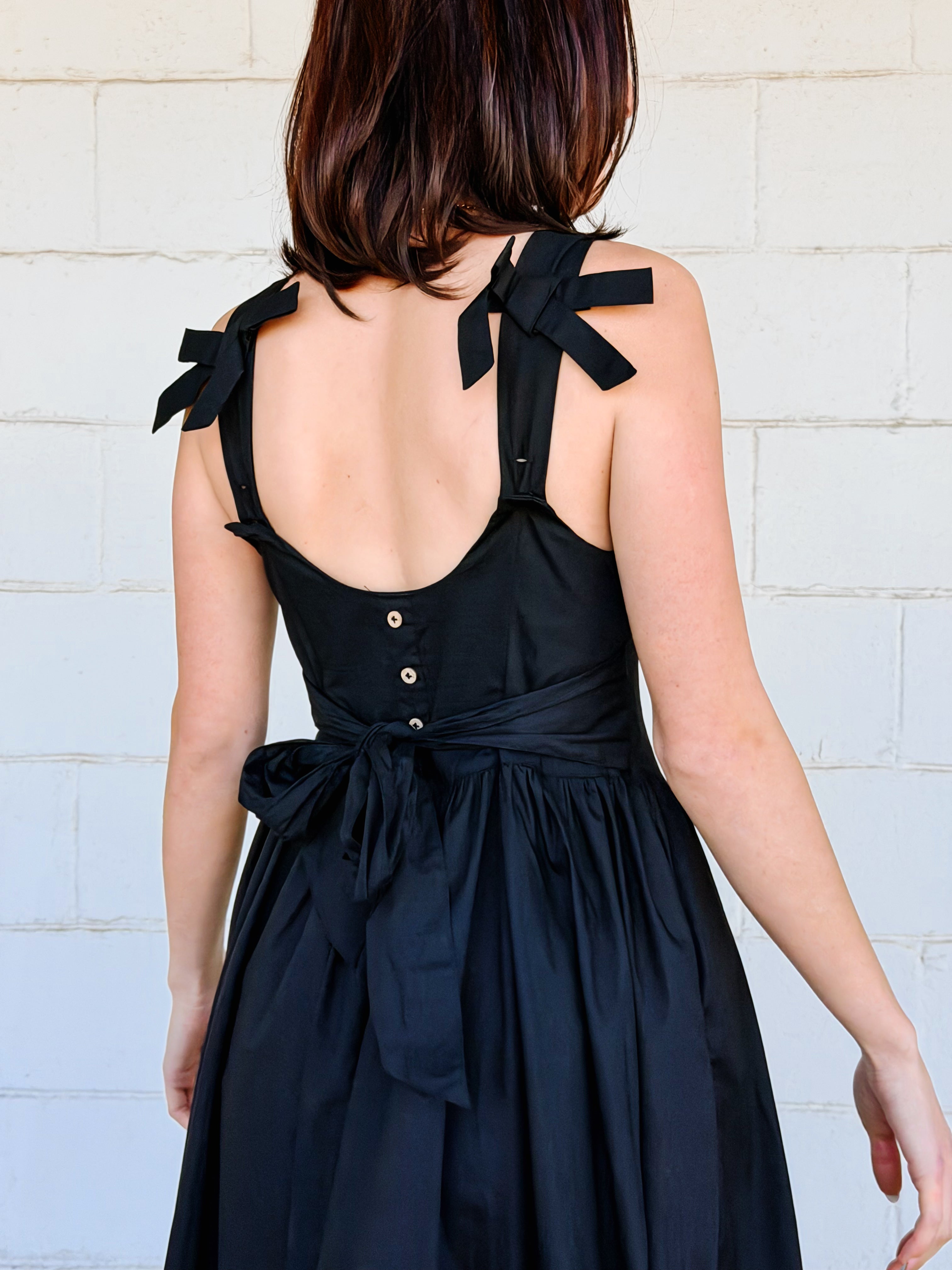 • black midi dress w/ pockets & shoulder bow detail