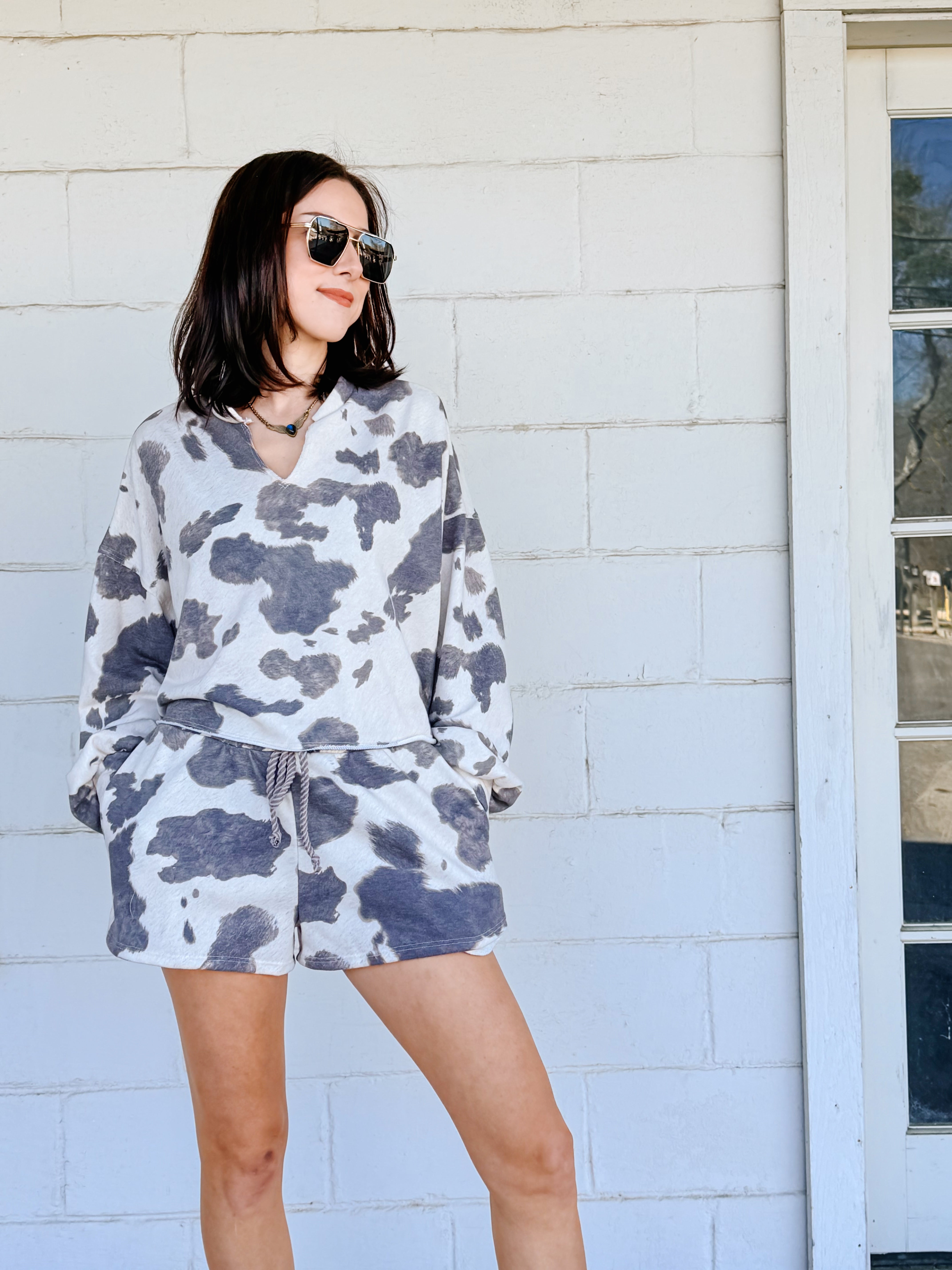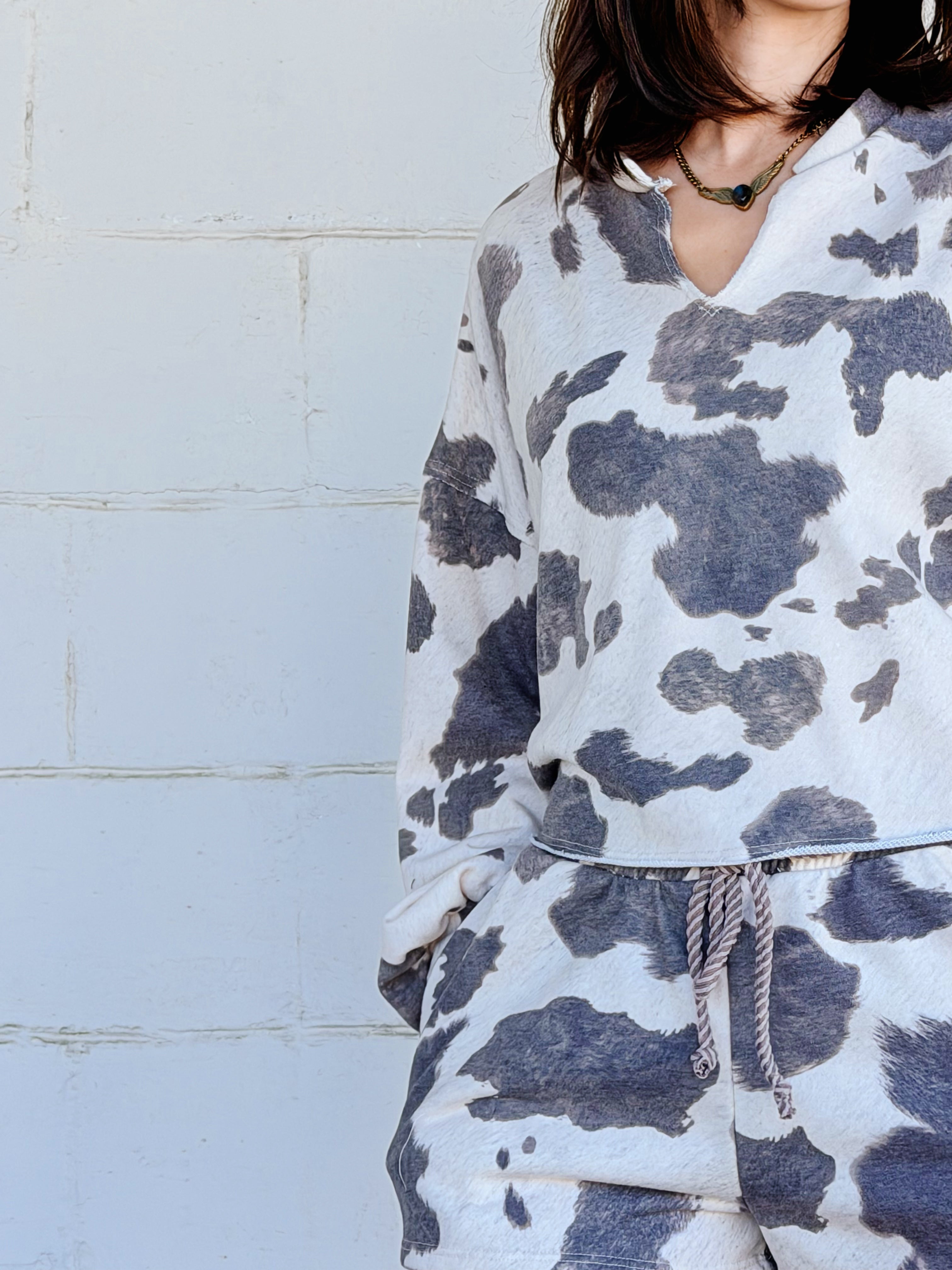 • cow print drawstring short with matching pullover