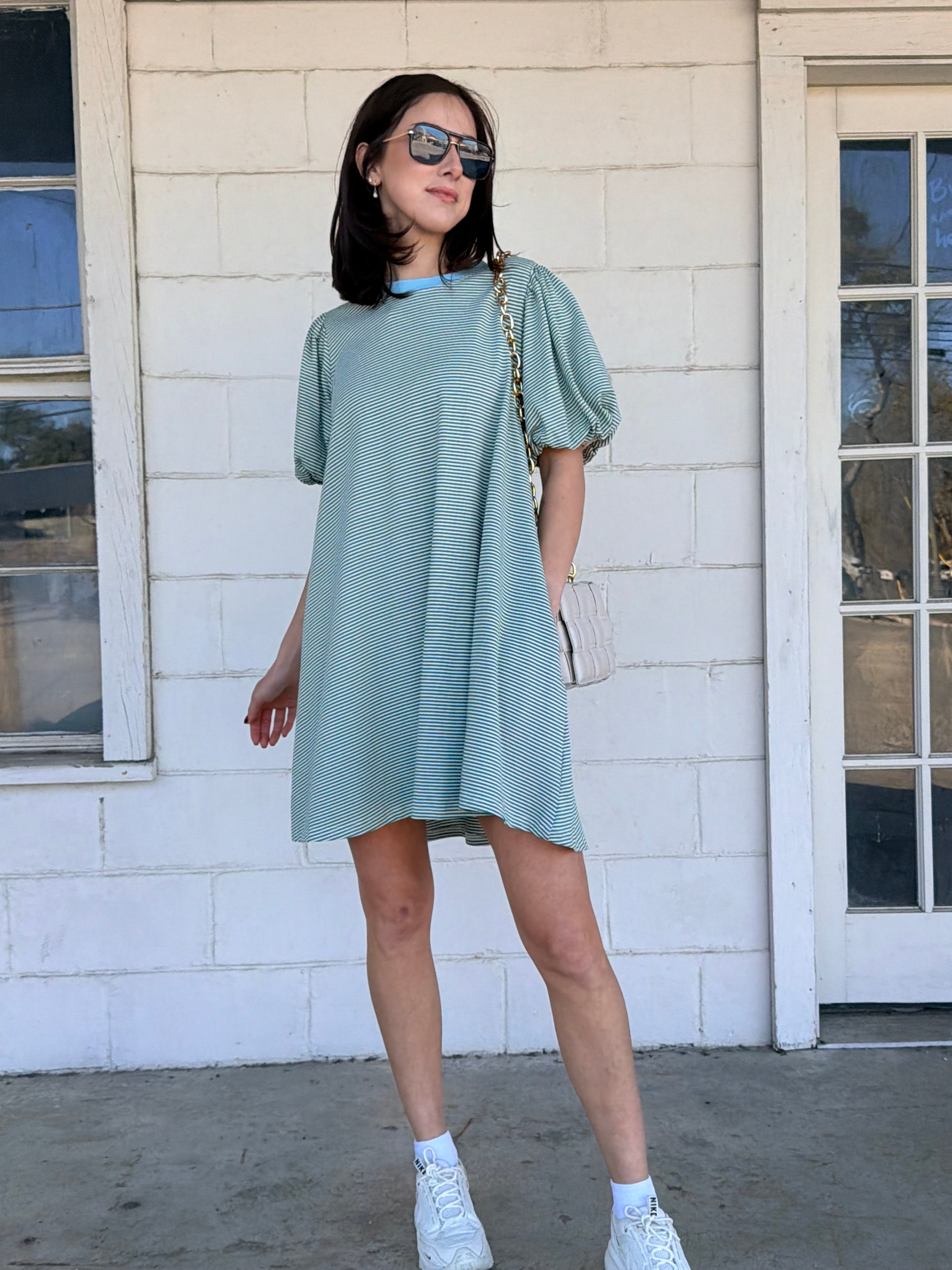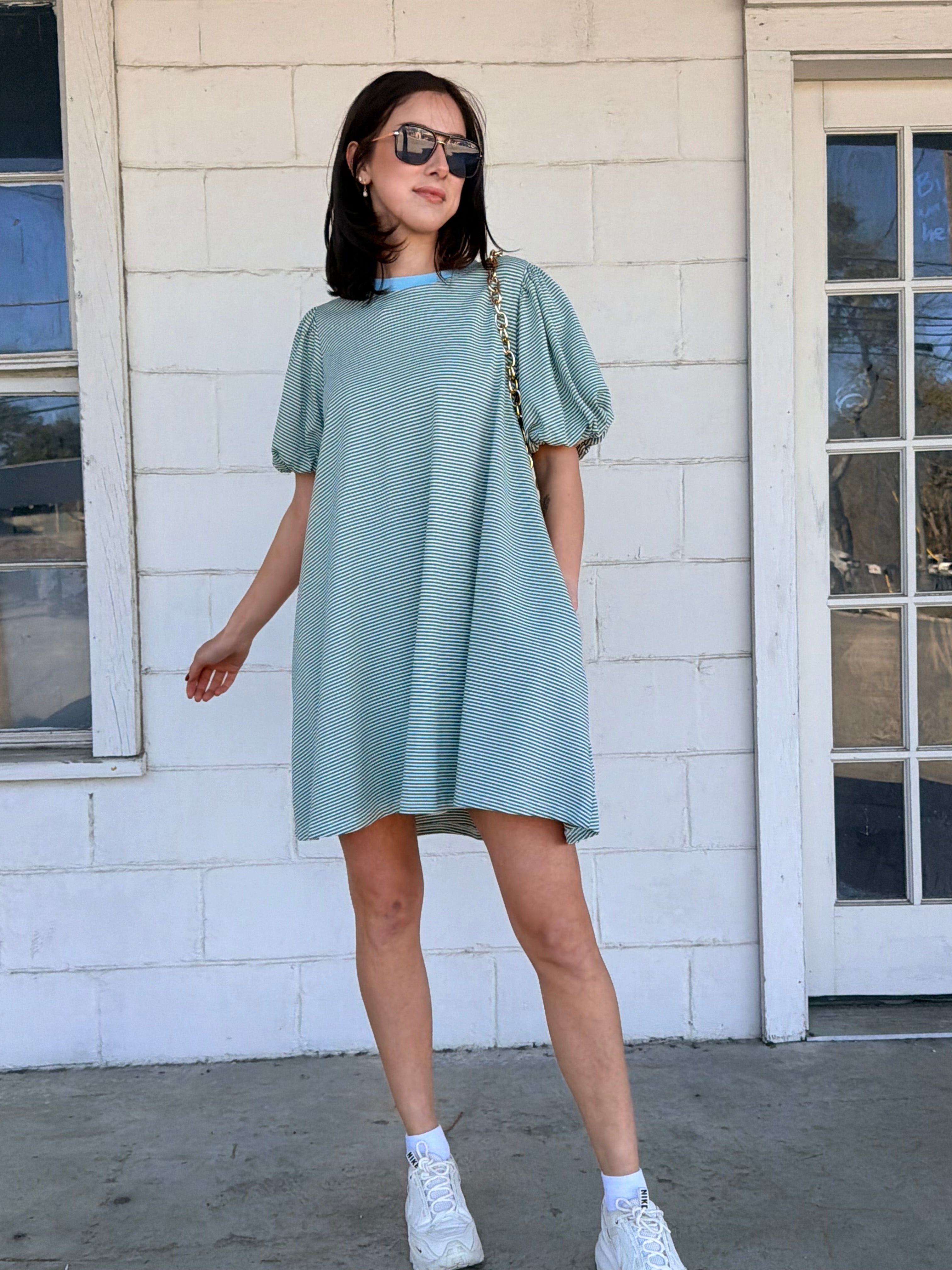 • pistachio & sky blue puff sleeve striped mini dress